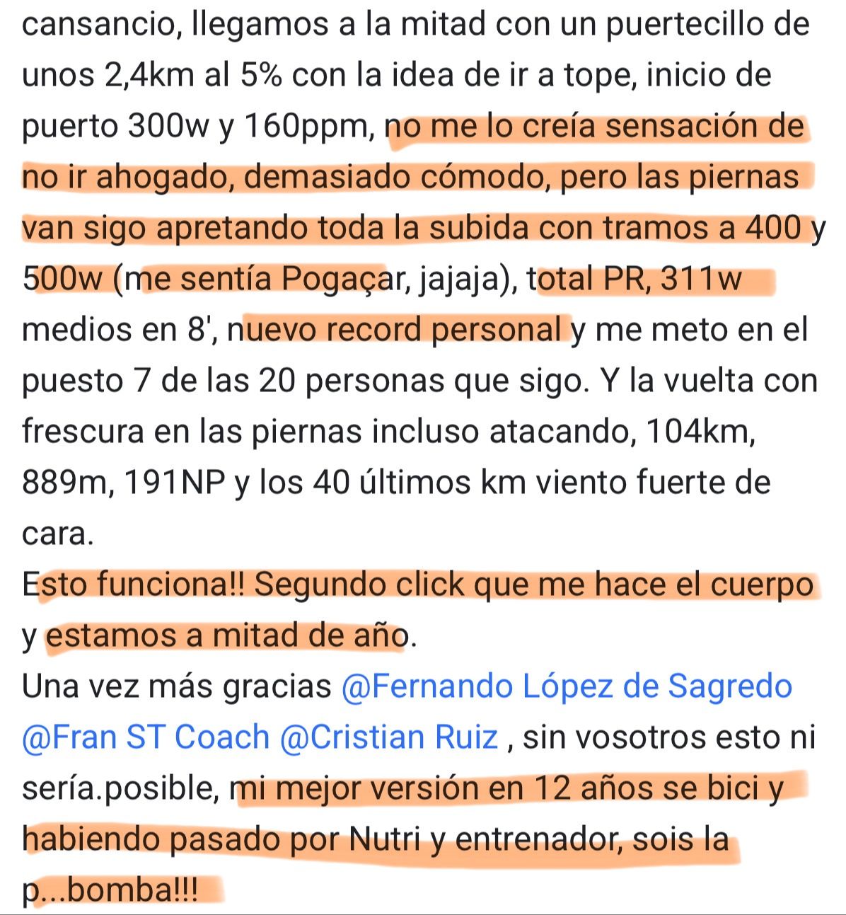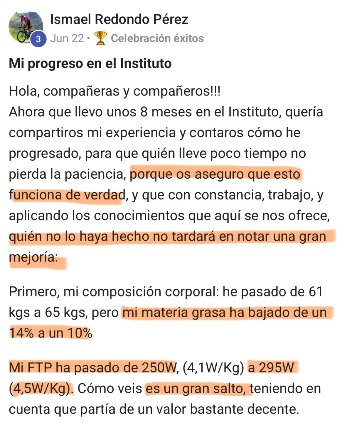 “En 3 meses he mejorado mi FTP en 51 vatios, pero lo mas fuerte es que lo he mejorado con menos horas y menos intensidad” - Salvador Gomez